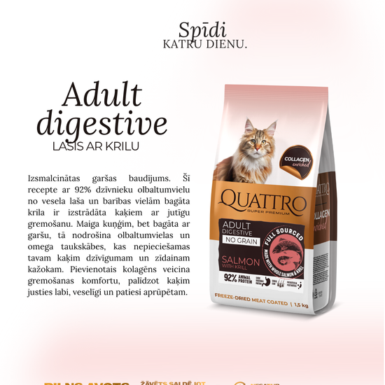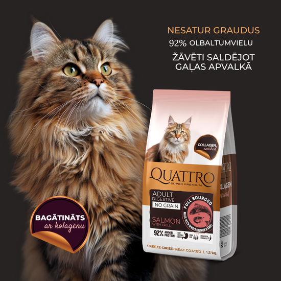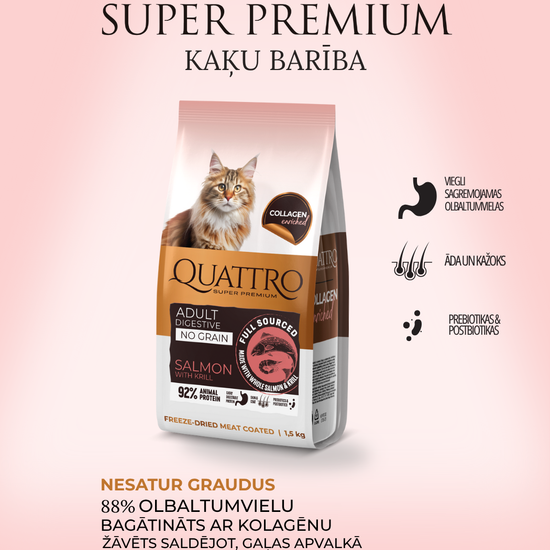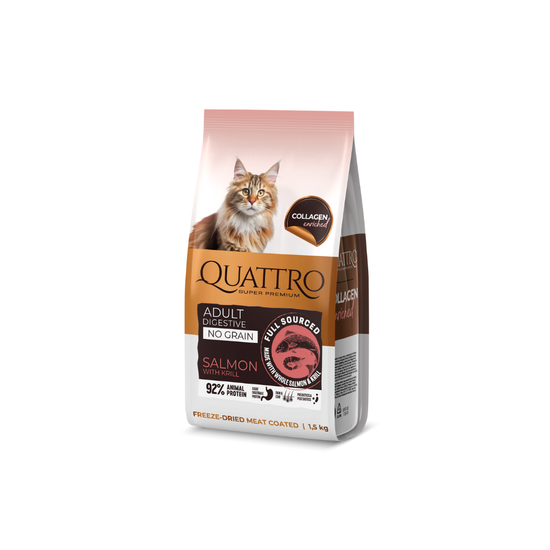Quattro dry cat food with salmon, krill and collagen for adult cats with sensitive digestion