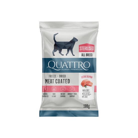 (aizsargāti ar dabīgu tokoferolu maisījumu), dehidrētas mājputnu izcelsmes olbaltumvielas (3 %), laša eļļa (2 %), celuloze (2 %), linsēklas, kaltētu biešu mīkstums, minerālvielas, liofilizēts lasis, prebiotikas (inulīns (0,2 %), manāna oligosaharīdi (0,015 %)).