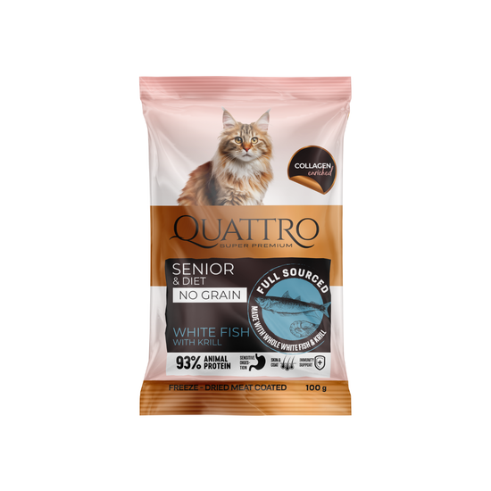 Paraugs: Quattro pilnvērtīga sausā kaķu barība ar baltajām zivīm un krilu kaķiem-senioriem un kaķiem ar lieko svaru
