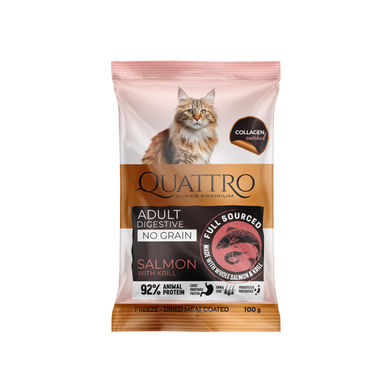Paraugs: Quattro sausā kaķu barība ar lasi, krilu un kolagēnu pieaugušiem kaķiem ar jutīgu gremošanu
