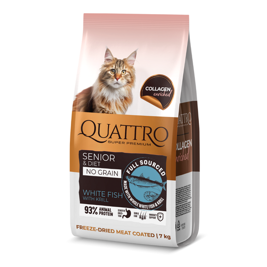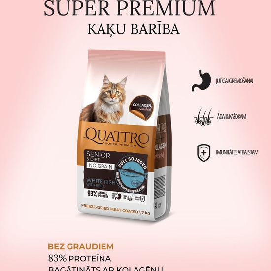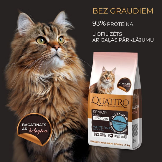 Quattro pilnvērtīga sausā kaķu barība ar baltajām zivīm un krilu kaķiem-senioriem un kaķiem ar lieko svaru
